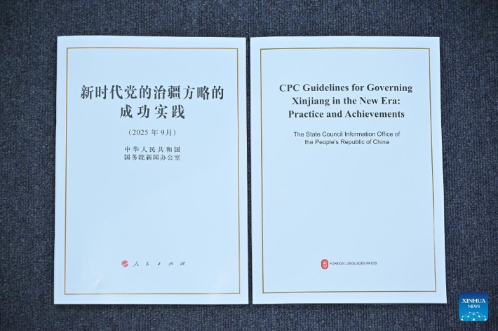 This photo taken on Sept. 19, 2025 shows copies of the white paper titled "CPC Guidelines for Governing Xinjiang in the New Era: Practice and Achievements" released by the State Council Information Office (SCIO). (XINHUA)