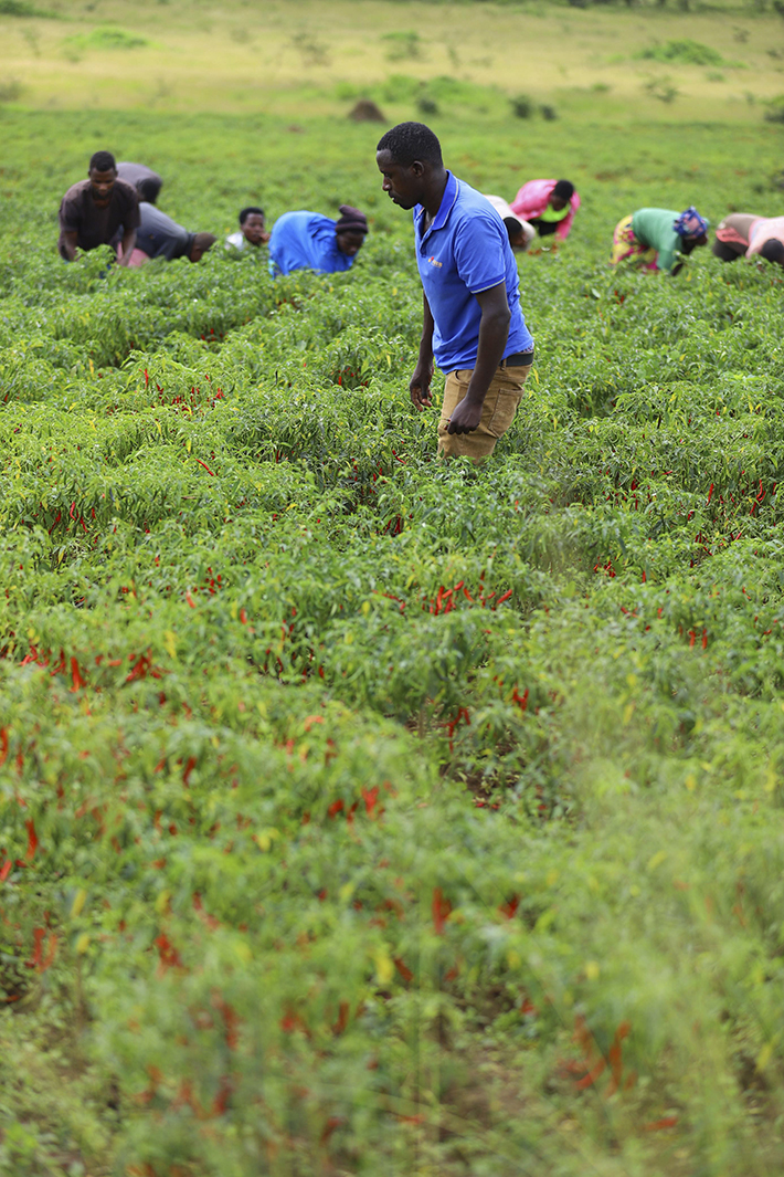 Employees of a farm work in a chilli pepper field in Rwanda on 22 May (XINHUA)
