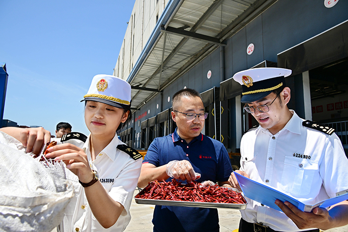 Customs officers inspect a shipment of dried Rwandan chilli peppers at a warehouse in Qingdao, Shandong Province, on 11 June (XINHUA)