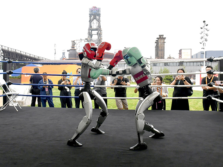 Two robots engage in a freestyle boxing match at the 2025 CIFTIS in Beijing on 10 September (DONG NING)