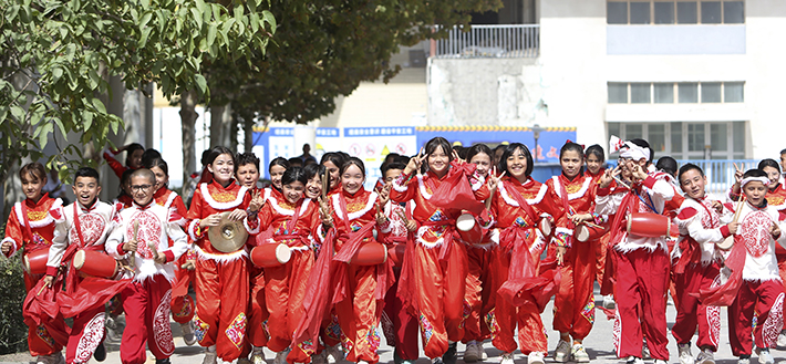 Primary school students in Atushi (Artux), Kizilsu Kirgiz Autonomous Prefecture, pose for photographs after a gong and drum performance on 12 September (XINHUA)