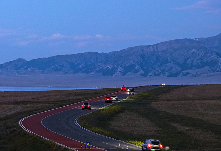 Tourists drive along a picturesque road in the Sayram Lake scenic area in Bortala Mongolian Autonomous Prefecture on 8 July (XINHUA)